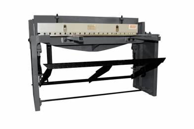 Подъем балки с верхним ножом осуществляется пружинами. Простота конструкции обеспечивает долговечность и неприхотливость станка. Для более точного расположения листа на рабочем столе станка, предусмотрены передние поддерживающие штанги, по которым перемещается передний упор. Этот элемент удобно использовать при подаче полосы листа из рулона в гильотину с тыльной стороны.