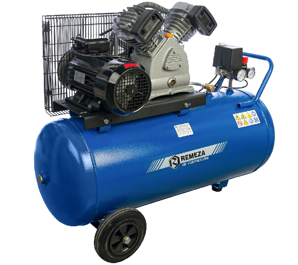 Компрессор поршневой с ременной передачей: давление 10 Атм, емкость ресивера 100 л., производительность 420 л/мин, напряжение 220В. Двигатель производства Франция.