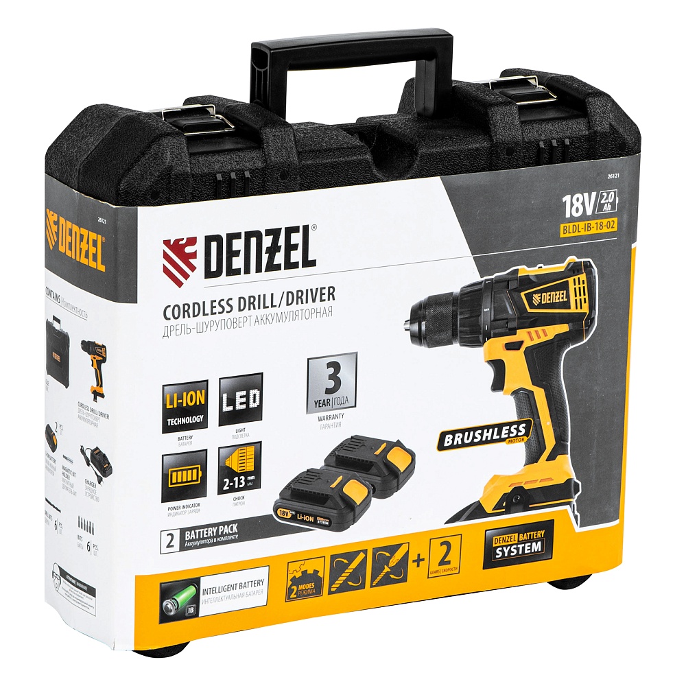 <p>Бесщеточная аккумуляторная дрель-шуруповерт Denzel BLDL-IB-18-02 26121 с  2 батареями 2 Ач Li-Ion на 18 В используется для выполнения большого спектра работ. Благодаря мощному бесщеточному двигателю, позволяющему развивать крутящий момент 65 Н·м, имеет КПД на 20-30% больше, чем у коллекторных дрелей. Инструмент легко справляется с закручиванием и откручиванием винтов, шурупов, саморезов, а также сверлением древесины, пластика, металла и размешиванием легких строительных смесей. Сверлит отверстия диаметром до 13 мм в металле и до 25 мм в древесине.</p><h2>Преимущества</h2><ul><li>Надежность и долговечность — металлический корпус редуктора устойчив к нагрузкам, бесщеточный двигатель отличается высокой производительностью.</li><li>Легкая замена оснастки — быстрозажимной одномуфтовый металлический патрон в сочетании с функцией блокировки шпинделя позволяет одной рукой устанавливать биту или сверло.</li><li>Два режима работы — можно установить скорость 0-500 / 0–2000  об/мин для работы с крепежом или получения отверстий в конструкционных материалах.</li><li>Настройка крутящего момента — 21+1 ступень регулировки усилия затягивания позволяет подстроиться под размер крепежа и твердость материала.</li><li>Высокая точность выполняемых работ — тормоз свободного выбега позволяет мгновенно остановить вращение шпинделя после выключения и избежать перетягивания крепежа.</li><li>LED-подсветка рабочей зоны — инструментом можно работать даже в малоосвещенных помещениях.</li><li>Быстрое переключение между задачами — функция реверса позволяет быстро переходить от закручивания к откручиванию крепежа, а также работать с болтами и гайками, имеющими левую резьбу.</li><li>Комфортная эксплуатация — обрезиненная рукоятка удобно лежит в руке и поглощает вибрации.</li><li>Универсальность — аккумуляторы 2 Ач Li-ion с интеллектуальной системой распознавания нагрузки совместимы с любым инструментом 18V Denzel battery system.</li><li>Надежные аккумуляторы — элементы питания с защитой от глубокого разряда и нежелательного перезаряда имеют увеличенный срок службы.</li><li>Бесперебойная работа — в комплект входит 2 аккумулятора емкостью 2 А/ч, время полной зарядки составляет 1 час, а индикатор уровня заряда подскажет, когда нужно заменить батарею.</li><li>Удобное хранение и транспортировка — инструмент поставляется в прочном пластиковом кейсе.</li><li>Гарантия 3 года — высокое качество дрели-шуруповерта подтверждено производителем.</li></ul>