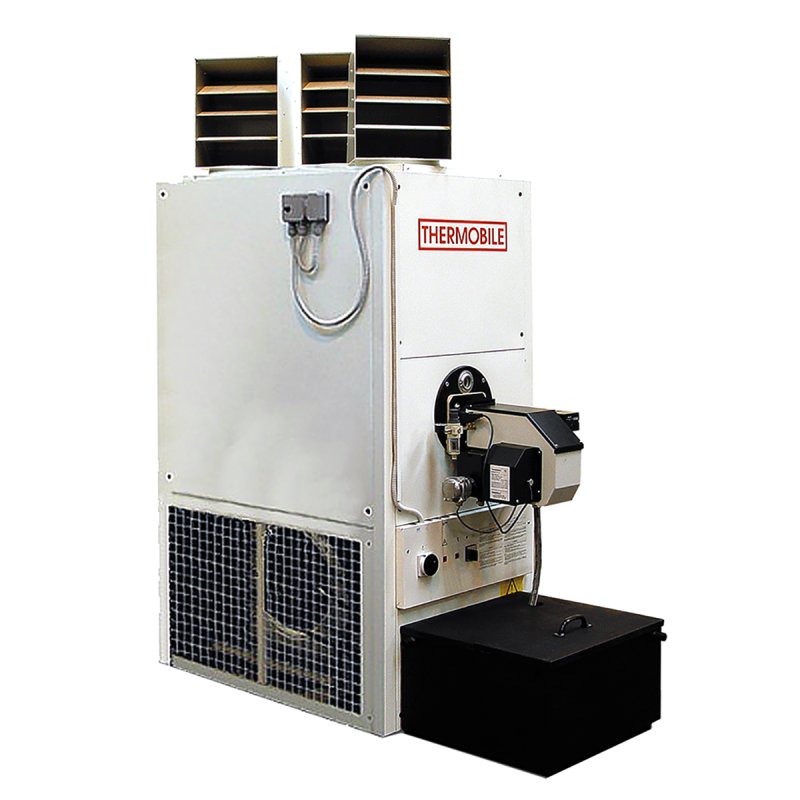 Стационарный нагреватель воздуха на отработанном масле Thermobile SB 80. Тепловая мощность 79 кВт. Расход топлива 9.0 л/ч. Объём топливного бака 55 л. Подключение: 380В.