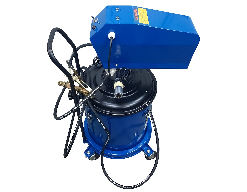 Корпус нагнетателя смазки – стальной, насос изготовлен из анодированной стали. Нагнетатель оборудован маслобензостойким армированным шлангом длиной 5 м. Насос для консистентной смазки. Производительность 750 г/мин. Солидолонагнетатель для консистентной смазки, установленный на колесах, имеет легкий вес и экономичную конструкцию для удобства перемещения и эксплуатации.