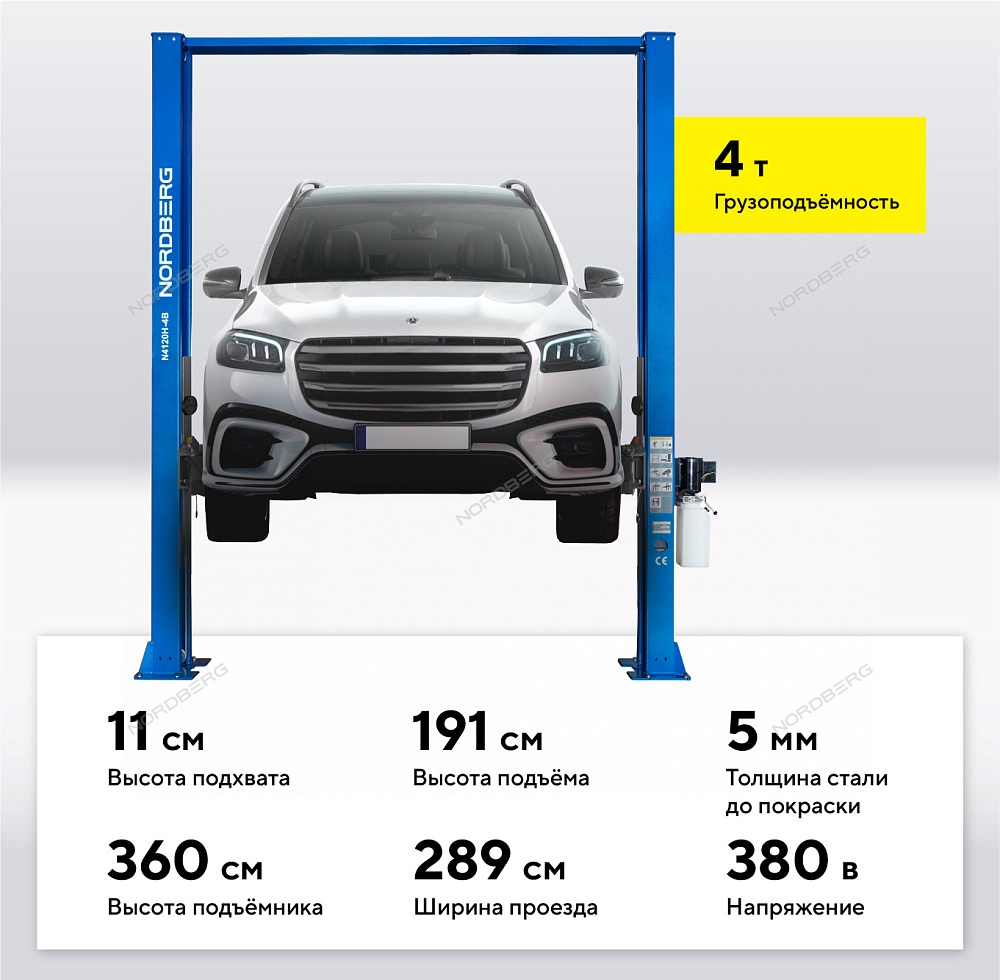 Подъемник двухстоечный 4 т, верхняя синхронизация, H=3,6 м, 380 В, синий NORDBERG N4120H-4B_3+2_380 купить в Москве цена ✅ - Все для СТО