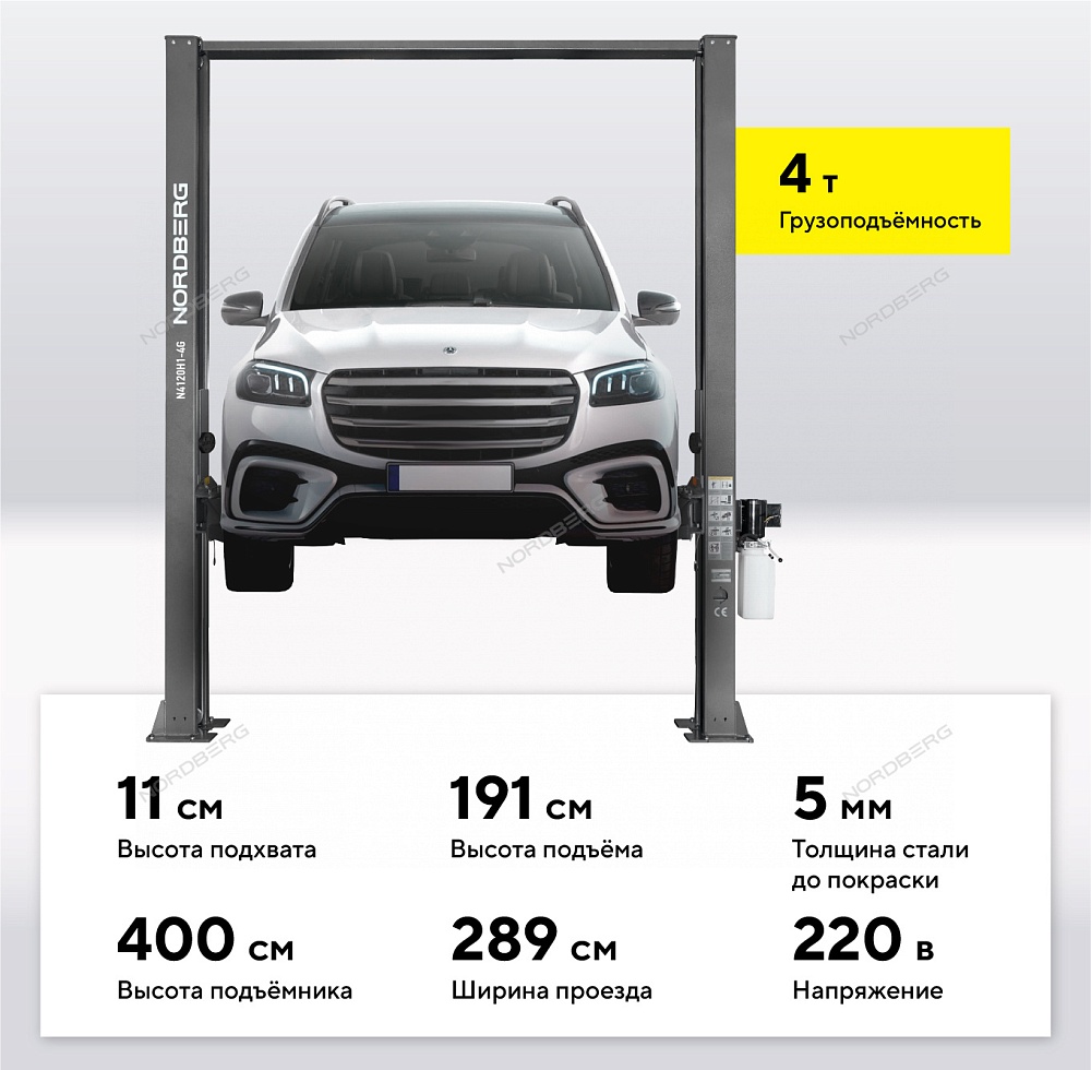 Подъемник двухстоечный 4 т, верхняя синхронизация, H=4 м, 380 В, серый NORDBERG N4120H1-4G_3+2_380 купить в Москве цена ✅ - Все для СТО