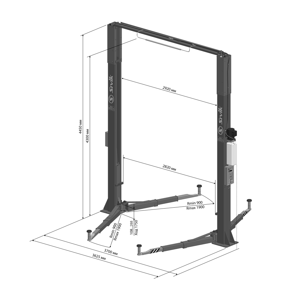 Двухстоечный электрогидравлический подъемник для легковых автомобилей, микроавтобусов, «джипов» и легких грузовиков типа «Газель» общей массой до 5 т.