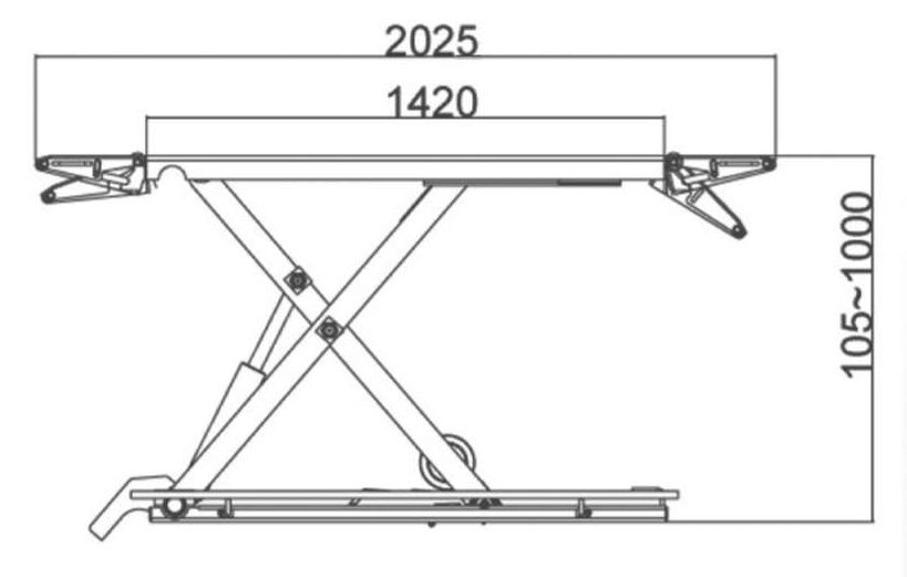 Подъемник ножничный, электрогидравлический, г/п 2800 кг., 2,2 кВт, высота подъема 1000 мм., размеры платформ 1420-2025х460 мм., клиренс 105 мм.