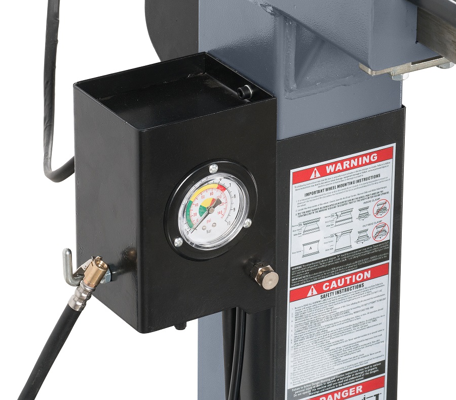 Манометр на колонне с шлангом для подкачки шин. Управление накачкой производится педалью в левой части корпуса станка.