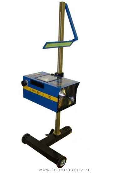 Прибор проверки и регулировки света фар оптико-механический, пластиковый наводчик, электронный люксметр, зеркальный визир, регулируемый измерительный щит, основание на колесиках, неподвижная стойка со скользящими нейлоновыми колодками.