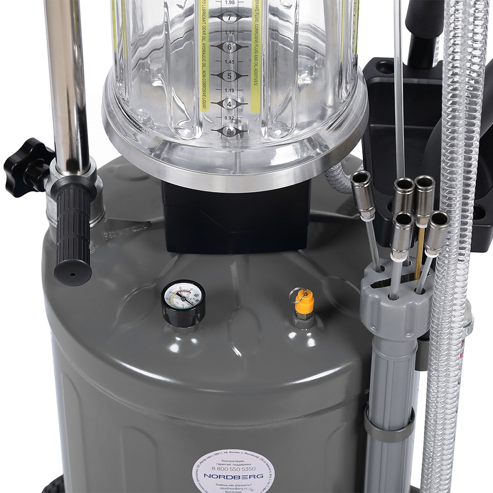 Установка для замены масла NORDBERG (2380) 2380G удаляет отработанное масло и другие жидкости из любого транспортного средства при помощи вентури-вакуумной вытяжной системы.