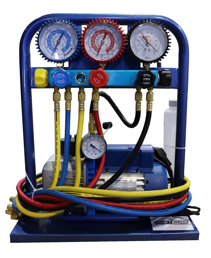 Бюджетный вариант установки для заправки автомобильных систем кондиционирования фреоном R134a. Возможно использование для заправки кондиционеров легковых и грузовых автомобилей, а также сельскохозяйственной техники. Установка представляет собой вакуумный насос "Value" от известного производителя, установленный на металлической раме, к которому подключен 5-вентильный коллектор с тремя манометрами, два из которых измеряют давление в системе кондиционрования (магистраль низкого и высокого давления), а третий измеряет значение вакуума и соединительные шланги длиной 1,5 метра, изготовленные из высококачественных материалов. Установка комплектуется заправочной ёмкостью для заправки масла и, при необходимости, UV красителя в систему кондиционирования, быстросъемными разъемами для подключения шлангов к автомобилю, а также высокоточными электронными весами.